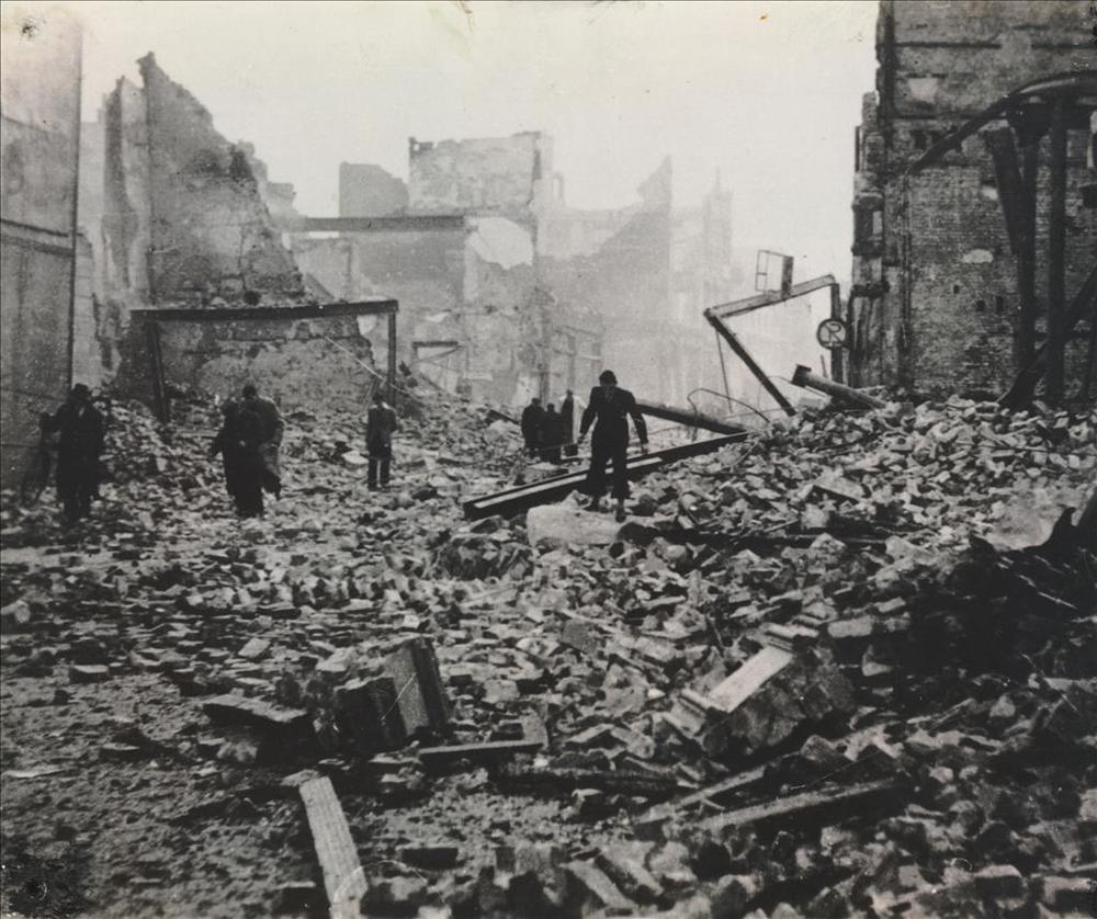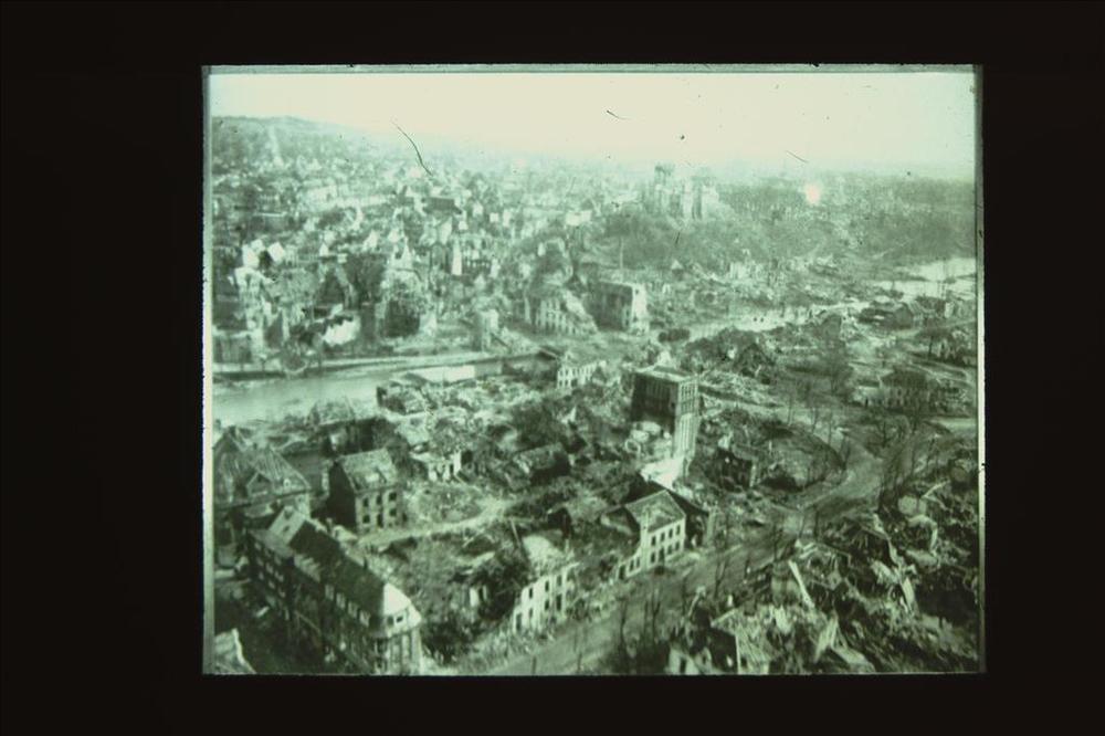 luchtfoto van gebombadeerde Duitse stad.