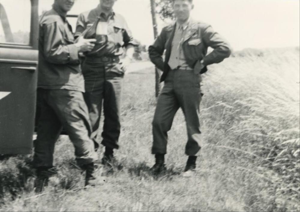 drie Amerikaanse militairen naast personenauto