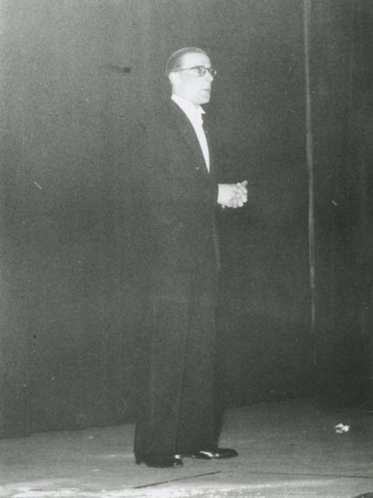 Foto van een man in avondkleding op toneel ter geleg...