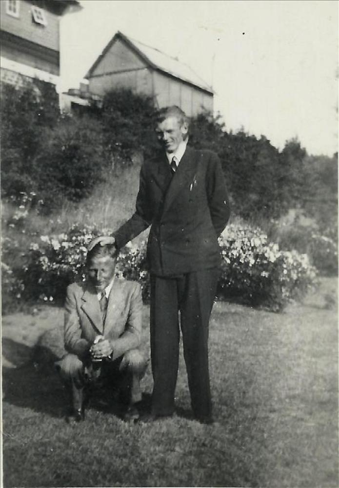twee jonge mannen, huisjes op achtergrond