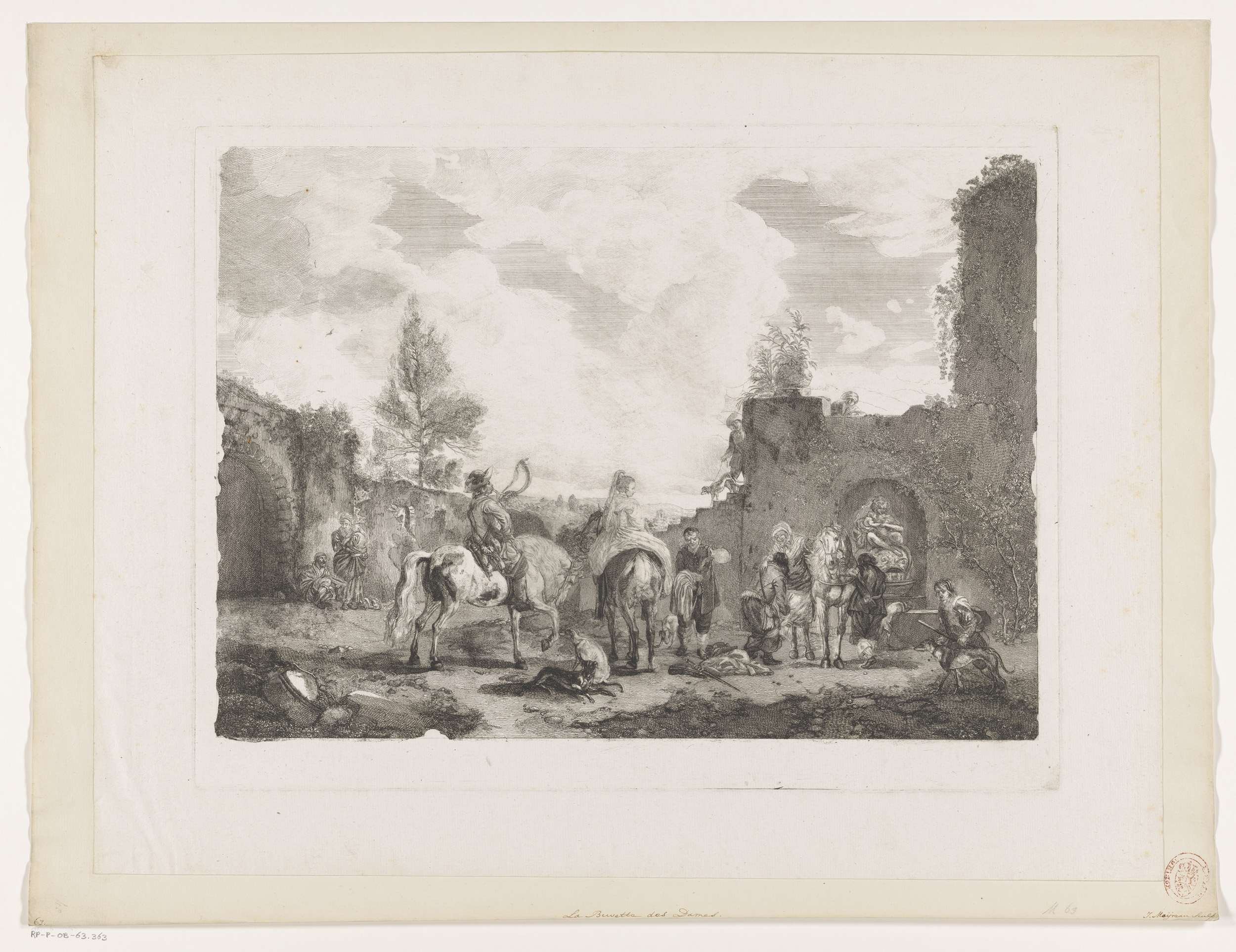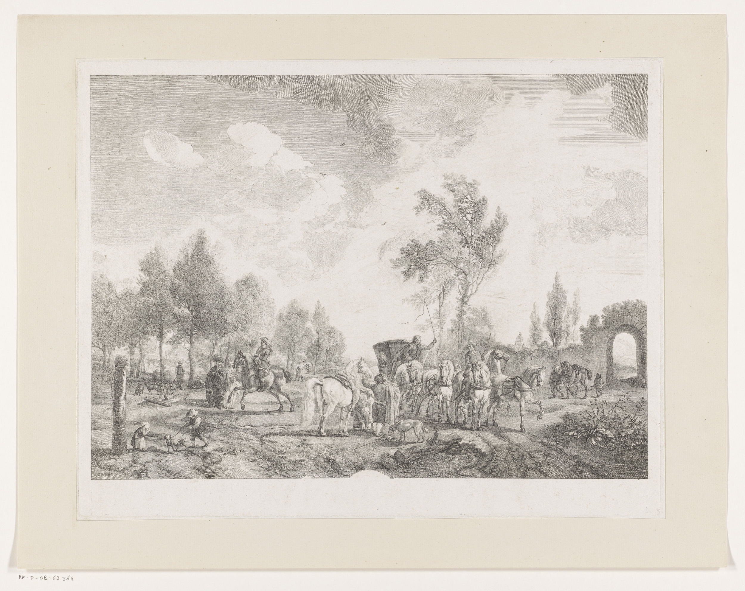 Ruiters en een koets met zes paarden in een landschap