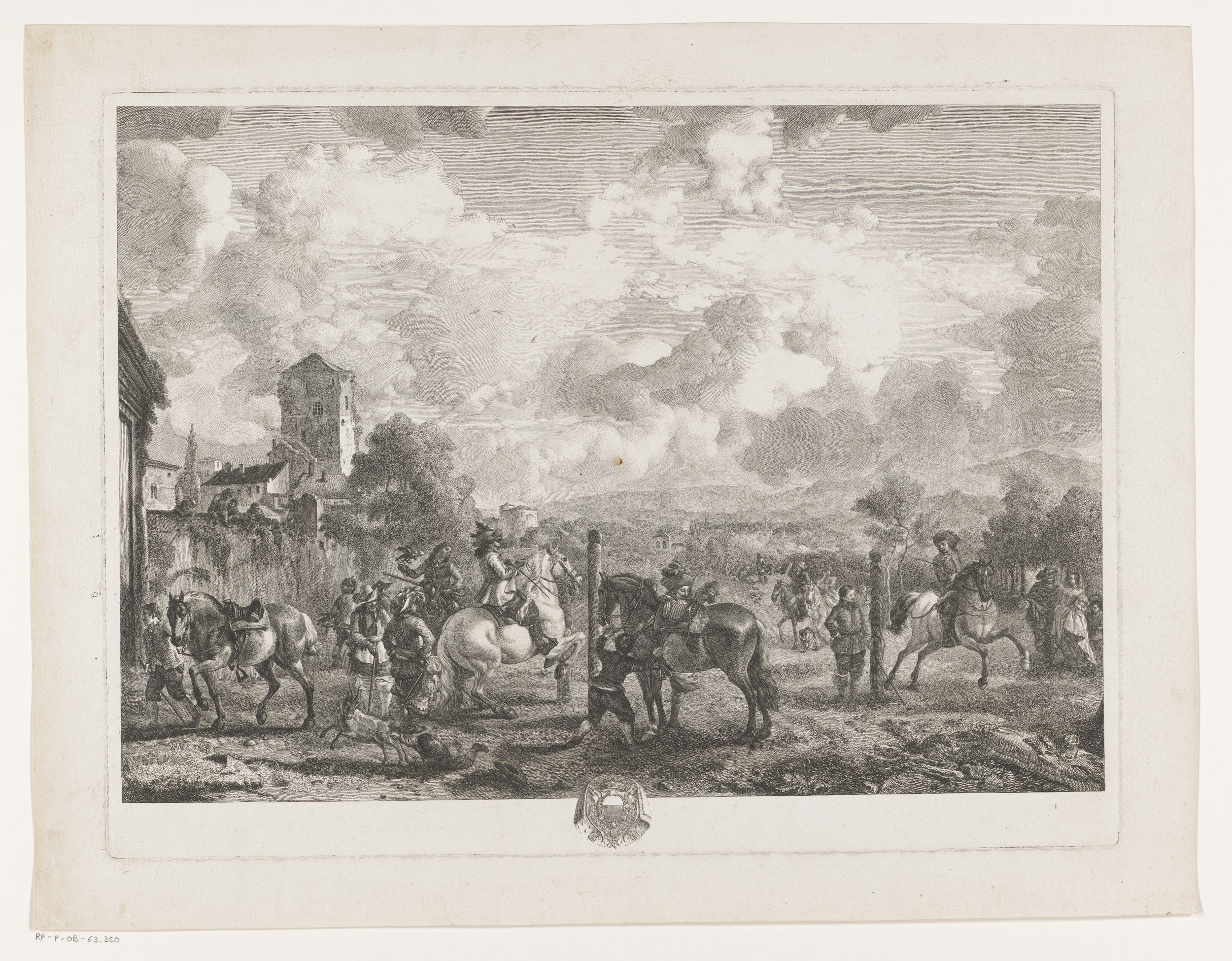 Elegant ruitergezelschap bij stadspoort