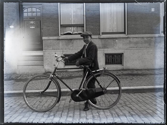 Glasplaatnegatief: jongen met fiets
