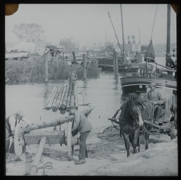Glasdia van werkende mannen in de Waalhaven