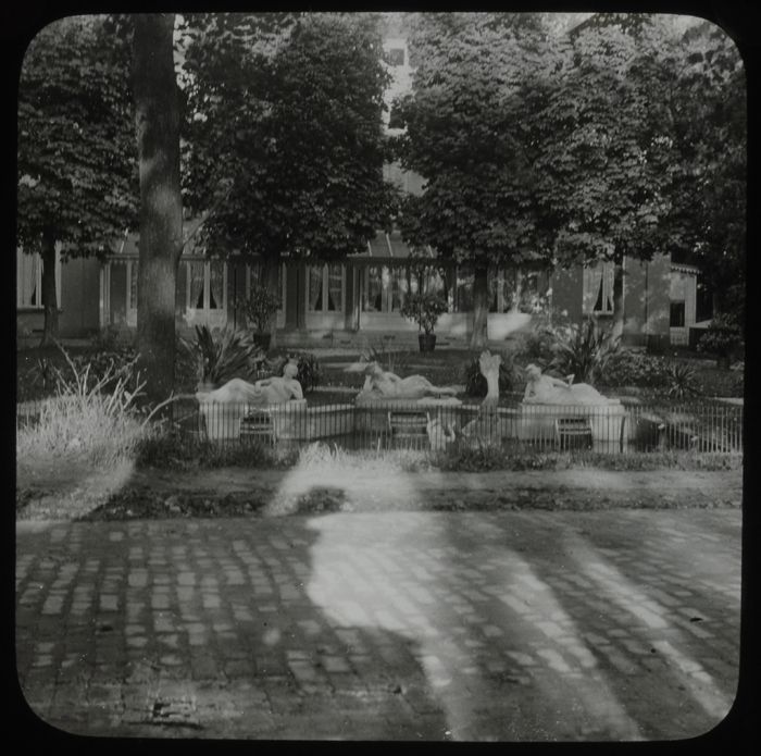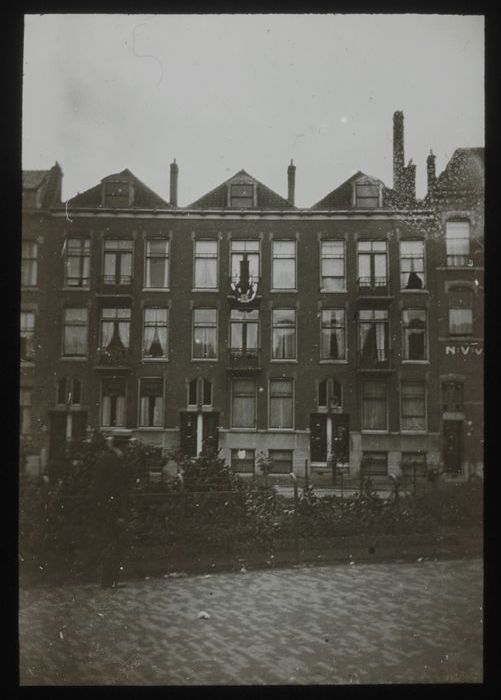 Glasplaatnegatief: huis aan singel met bloemenmozaïek