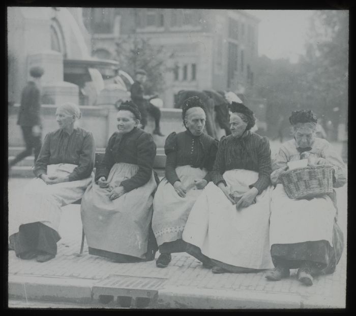Glasdia van Calandmonument met oude vrouwen op bankje