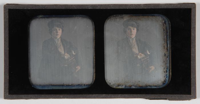Stereoscoopplaat, daguerreotypie: portret van staand...