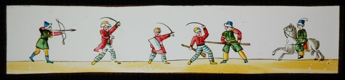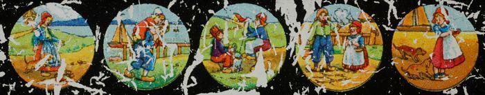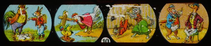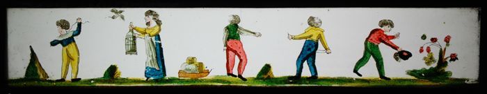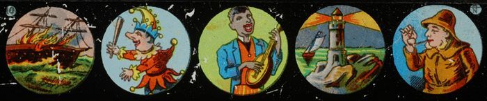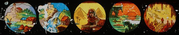 Lantaarnplaatje met vijf verschillende afbeeldingen