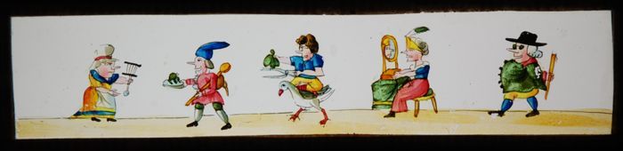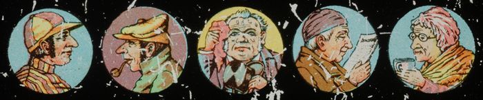 Lantaarnplaatje met vijf karikaturale types