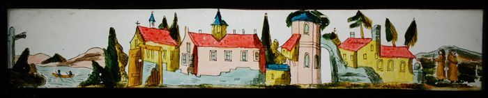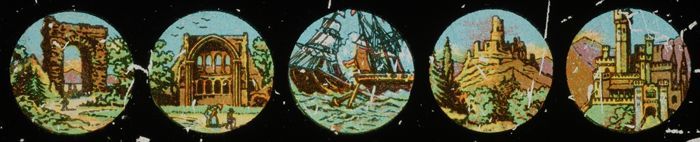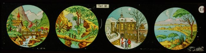Toverlantaarnplaat met vijf landschappen