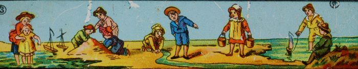 Lantaarnplaatje met spelende kinderen aan het strand