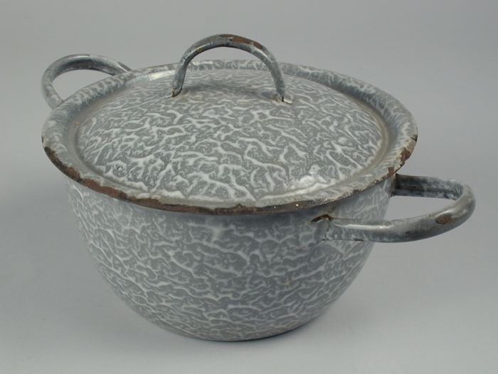 Grijs gewolkte pan met twee handgrepen en deksel
