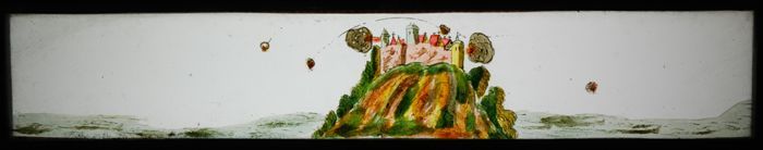 Lantaarnplaatje met ruïnes, schipbreuk en een kasteel
