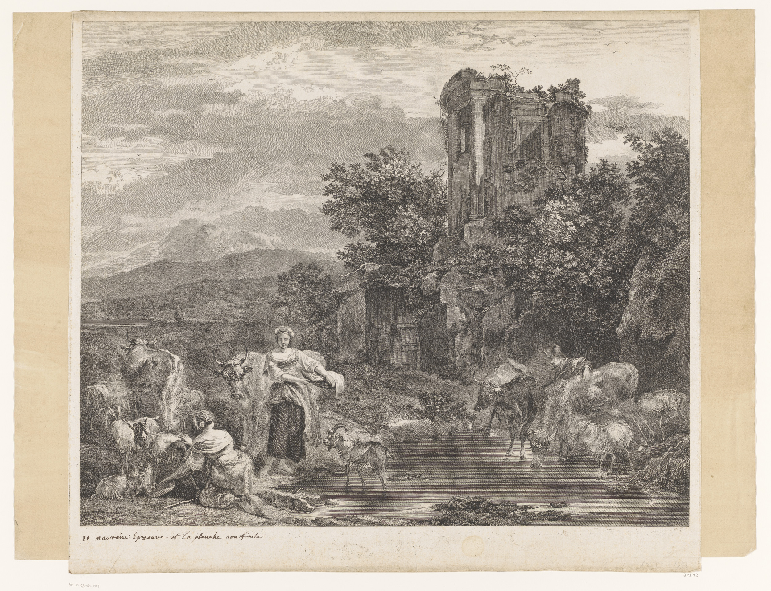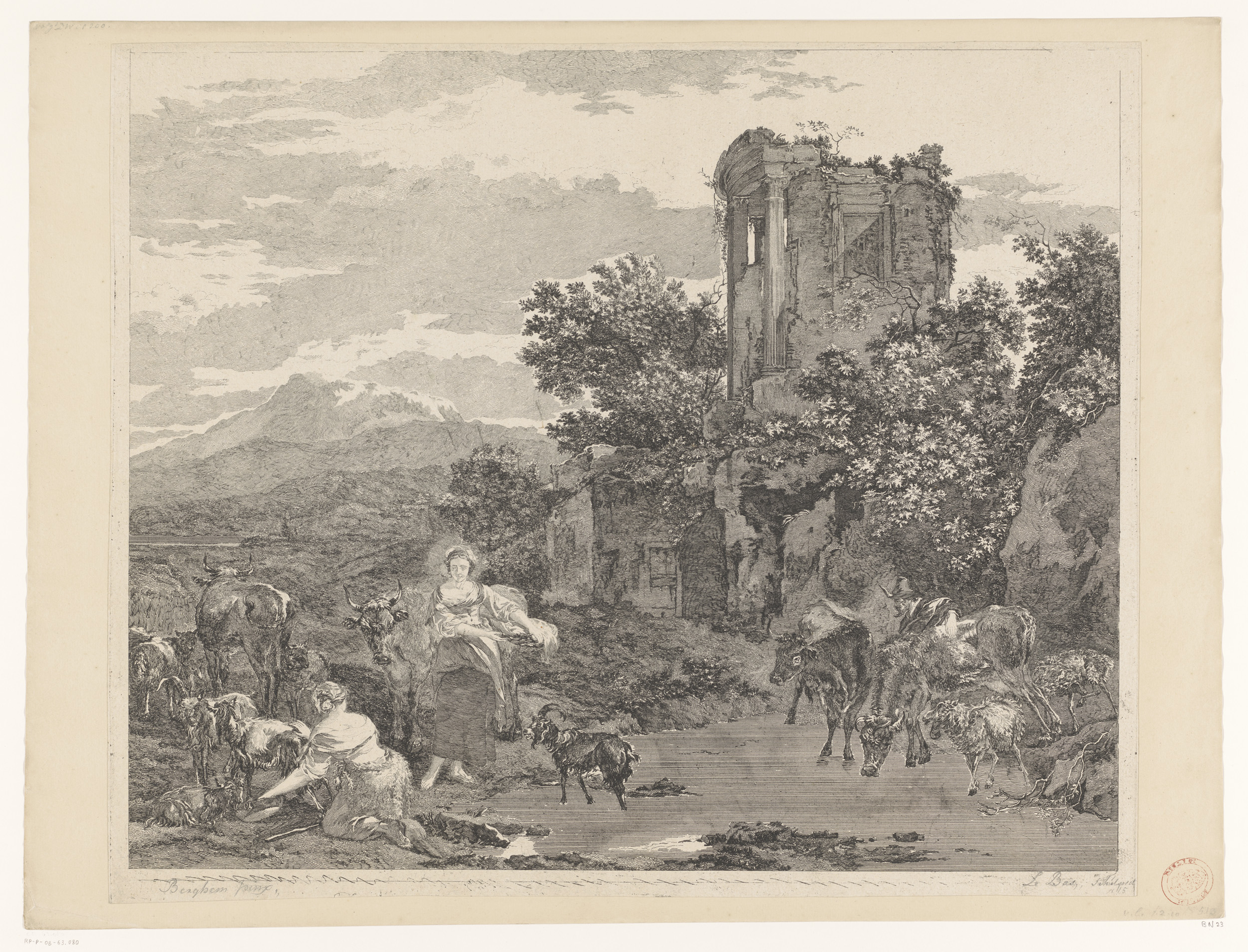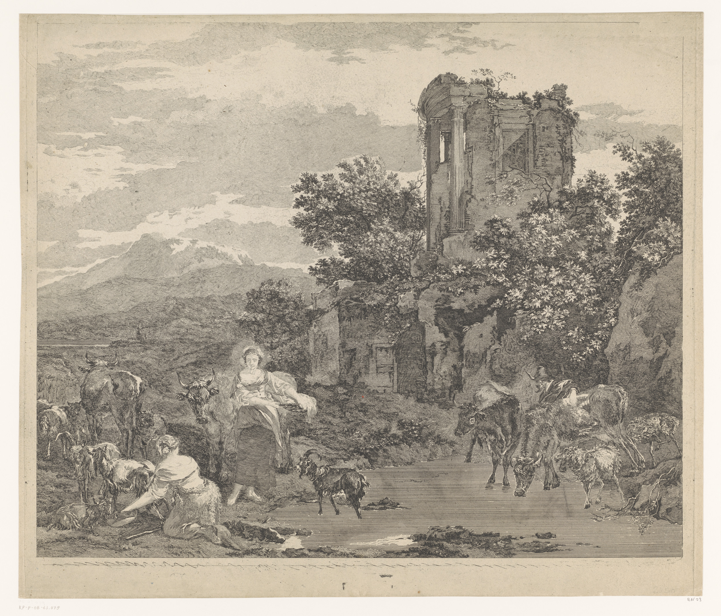 Landschap met twee herderinnen en drinkend vee bij e...