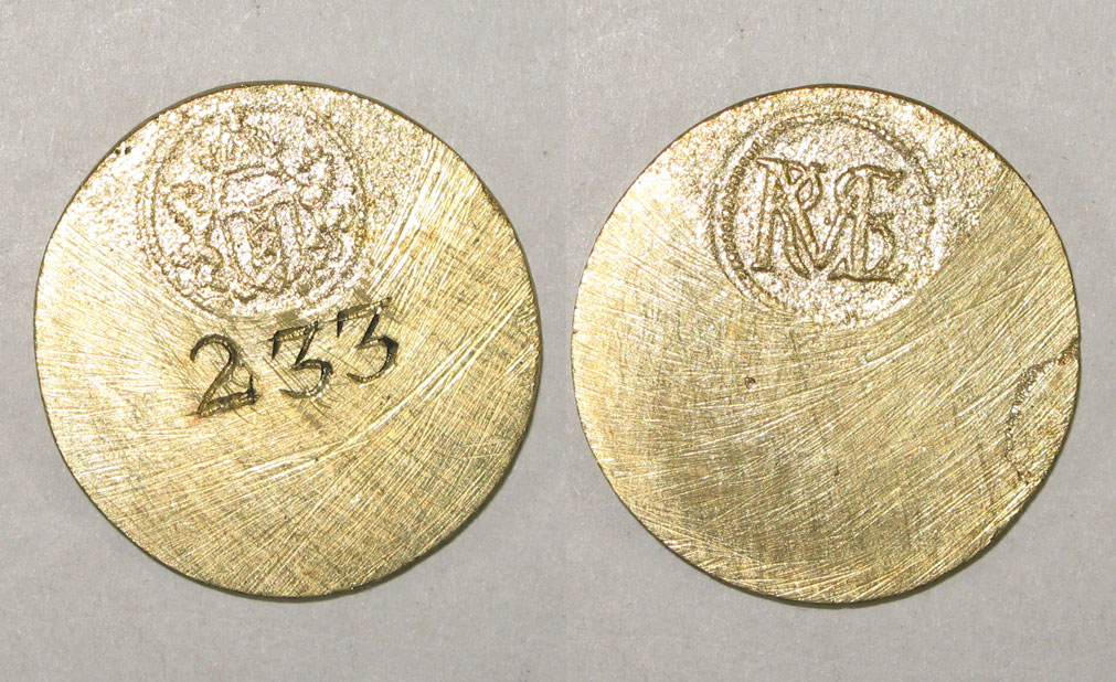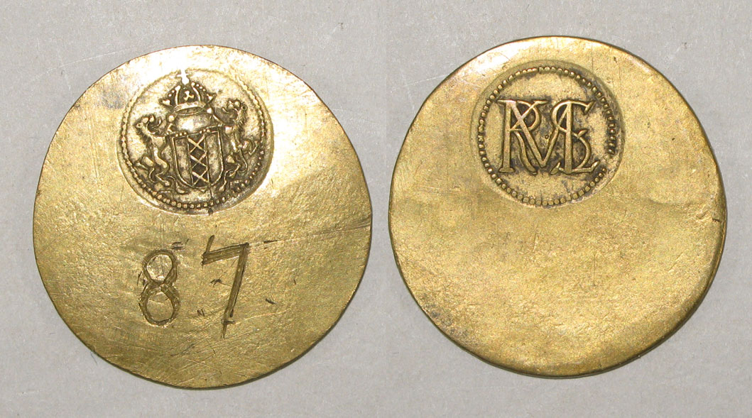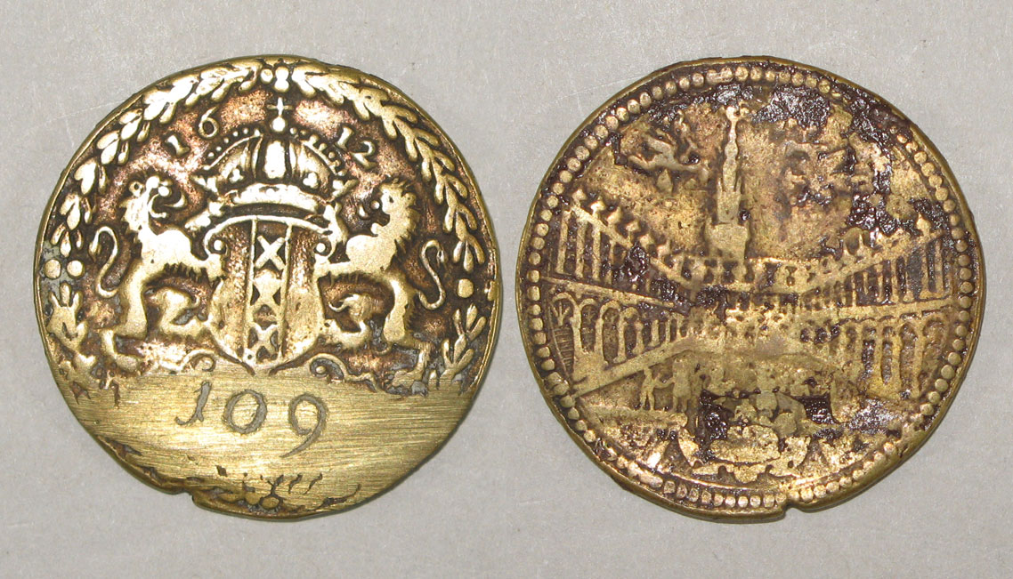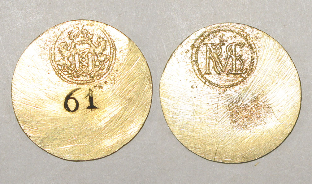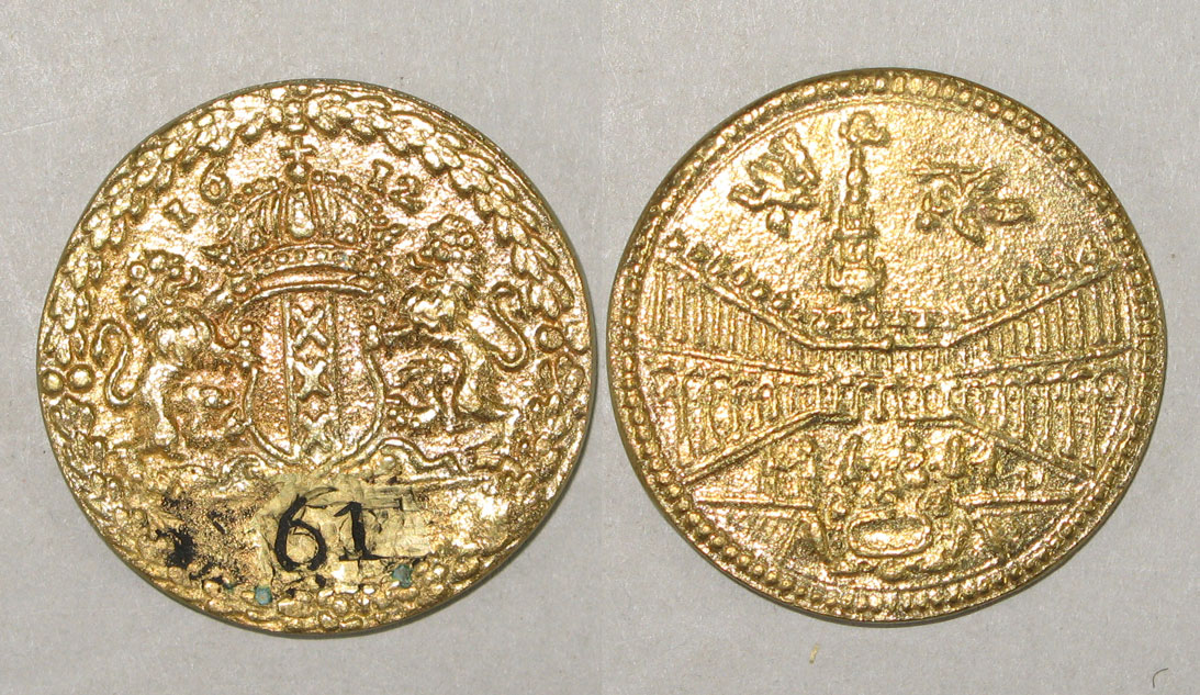 Twee makelaarsgildepenningen in papieren wikkel, nr. 61