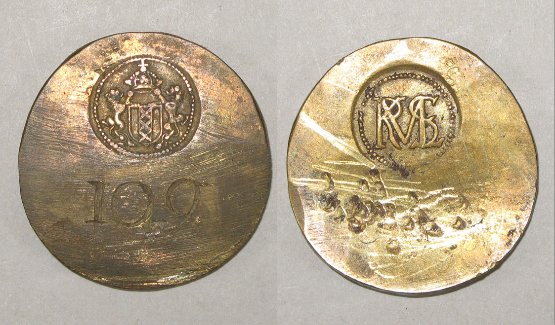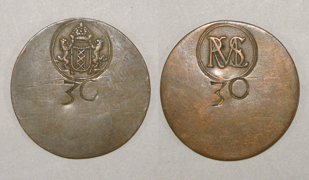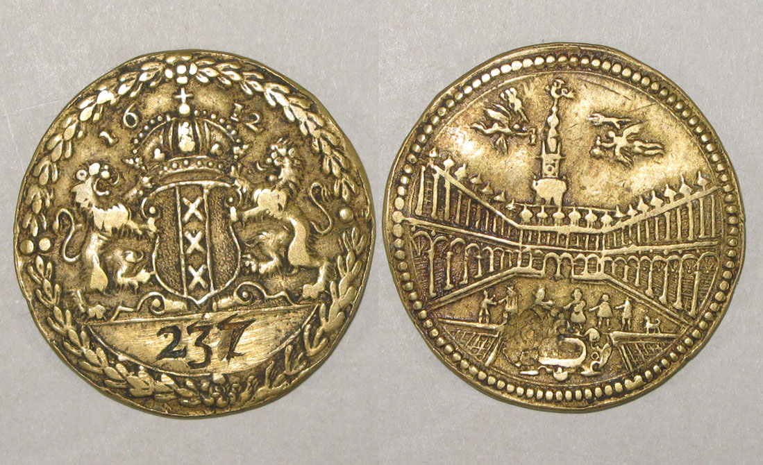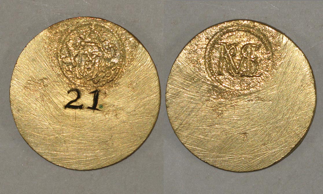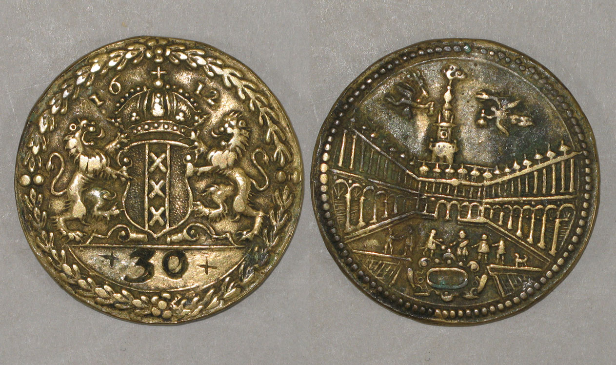 Twee makelaarsgildepenningen in papieren wikkel, nr. 61