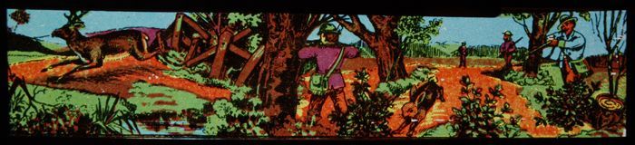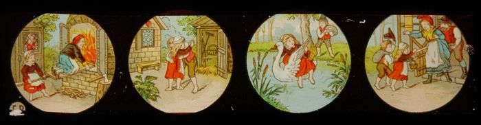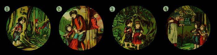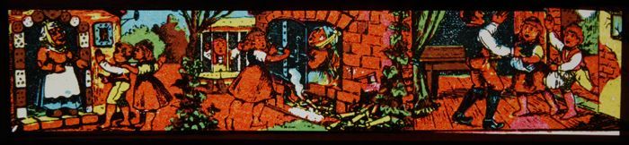 Lantaarnplaat met eerste deel sprookje Hans en Grietje