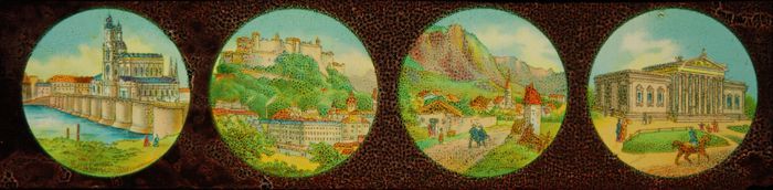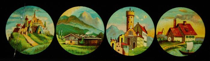 Lantaarnplaat met vier afbeeldingen van gebouwen
