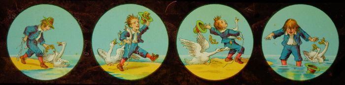 Lantaarnplaat met komische sketch: jongen met ganzen