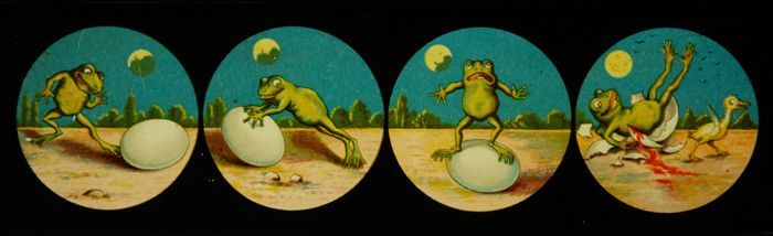 Lantaarnplaat met komische sketch: kikker met ei in ...