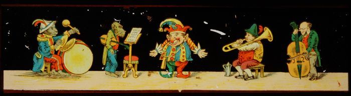 Lantaarnplaat met musicerende mensen en apen