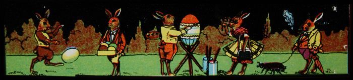 Lantaarnplaat met aangeklede hazen en geverfde eieren
