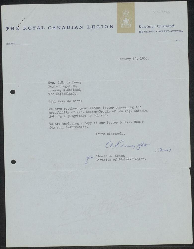 Brief van Thomas A. Kines, Royal Canadian Legion