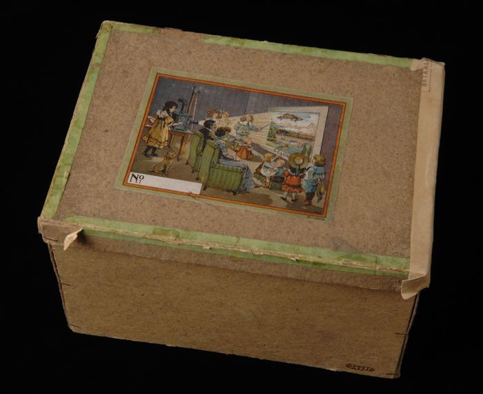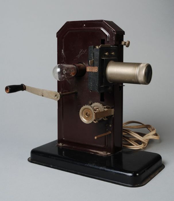 Toverlantaarn voor film met twee lenzen en schoorste...