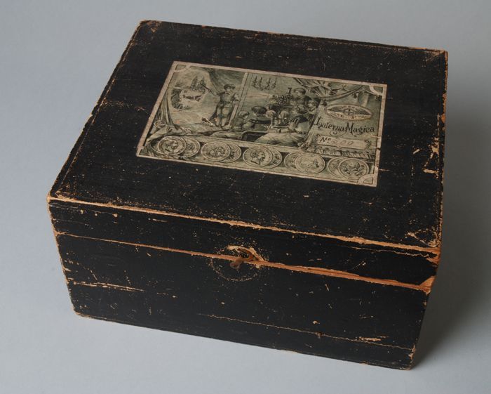 Toverlantaarn met drie lenzen en geknikte schoorstee...