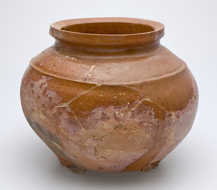 Lage pot van rood aardewerk op standvinnen met spaar...