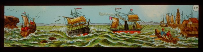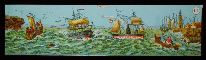 Toverlantaarnplaat "E.P." (Ernst Plank) met havenmon...