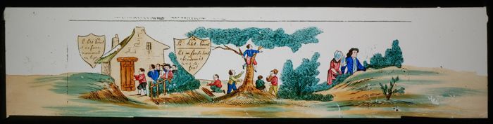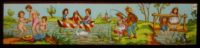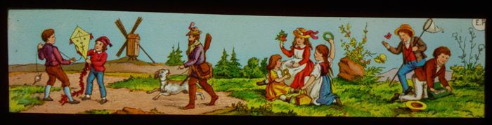 Lantaarnplaat, merk J.F., met spelende kinderen bij ...
