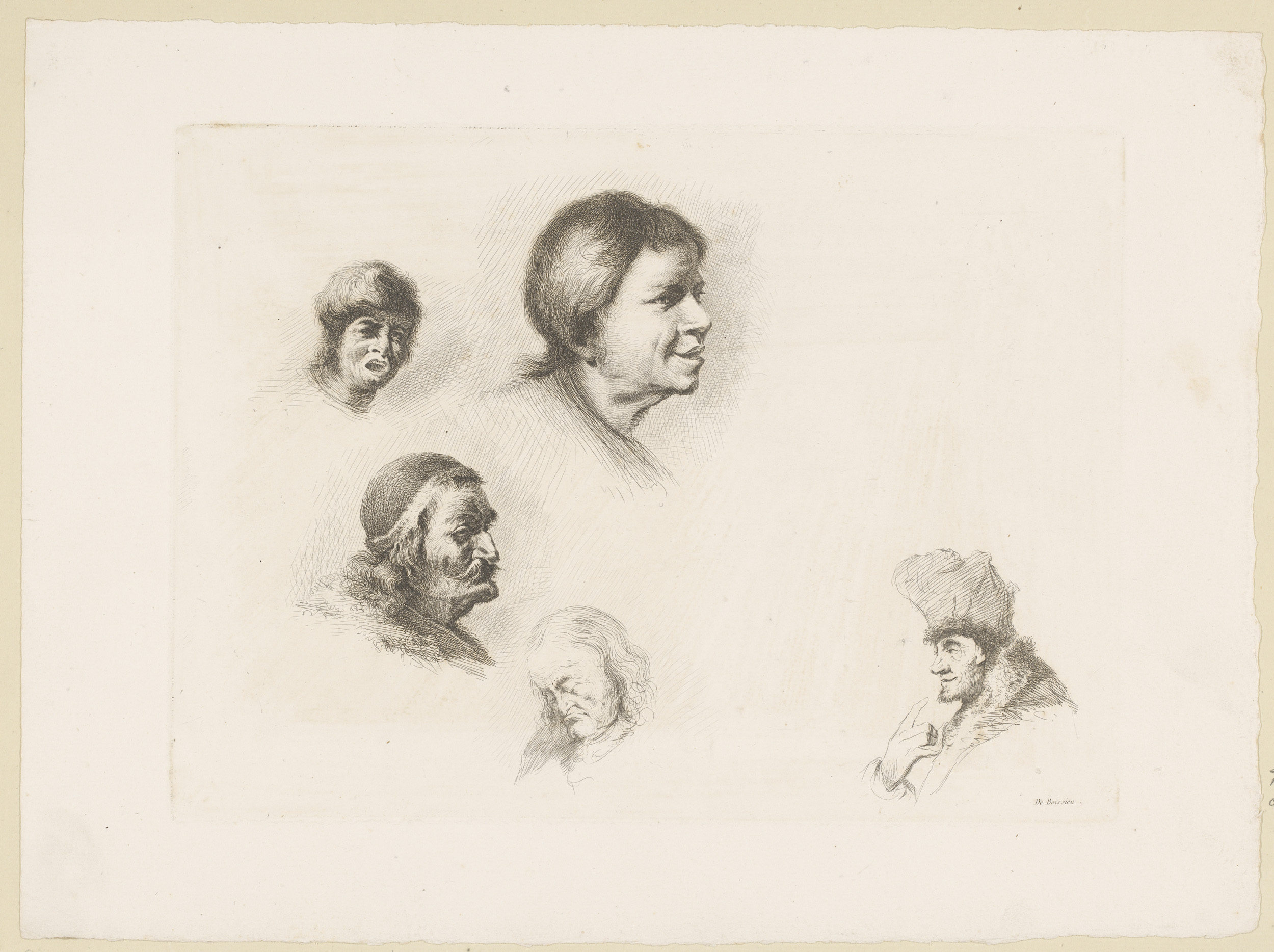 Compositie met vijf hoofden van mannen van verschill...