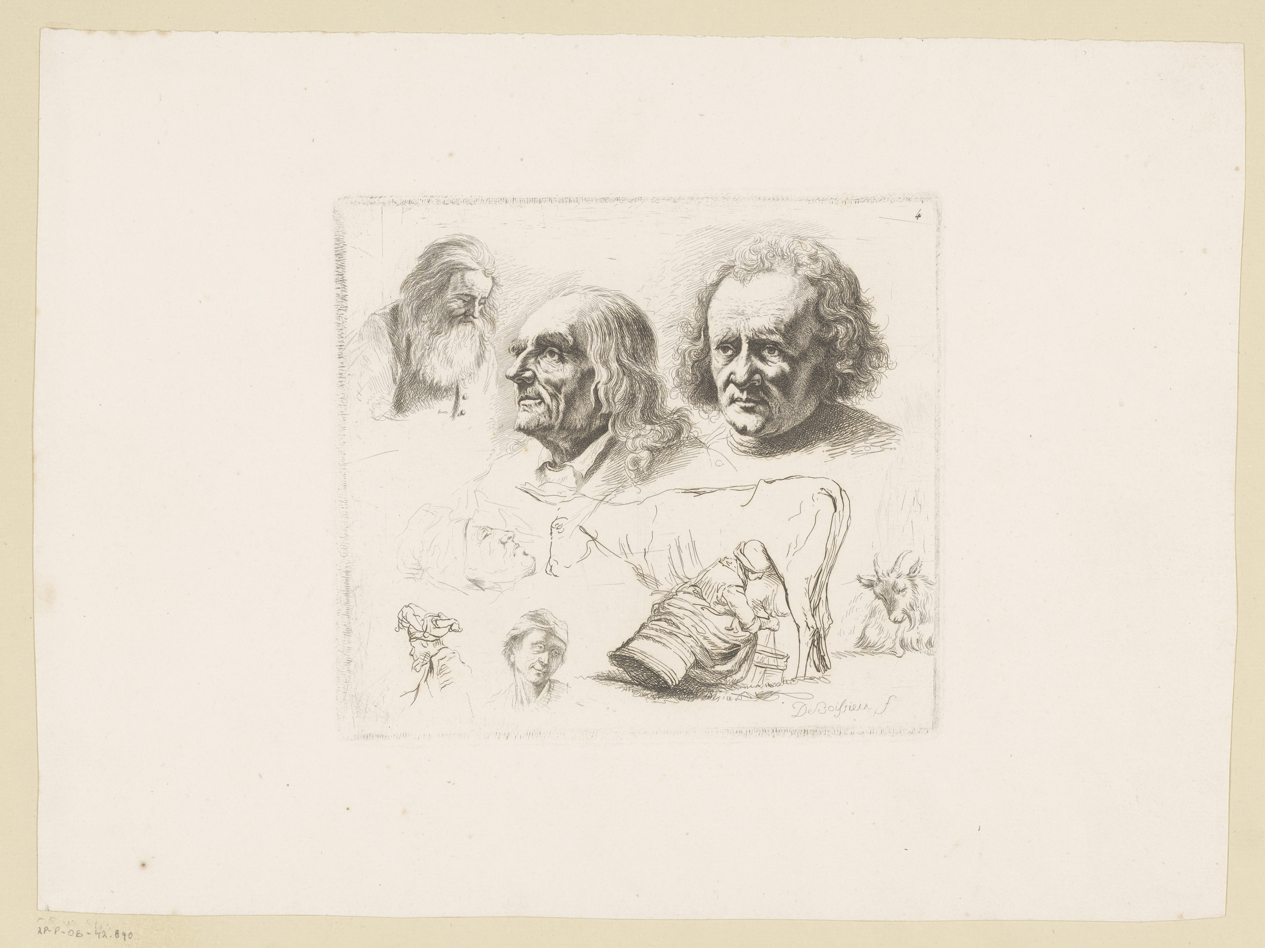 Compositie met koe, bok en zes hoofden van mannen va...