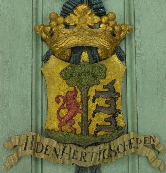 Gekroond familiewapen uit eikenhout gesneden, gouden...