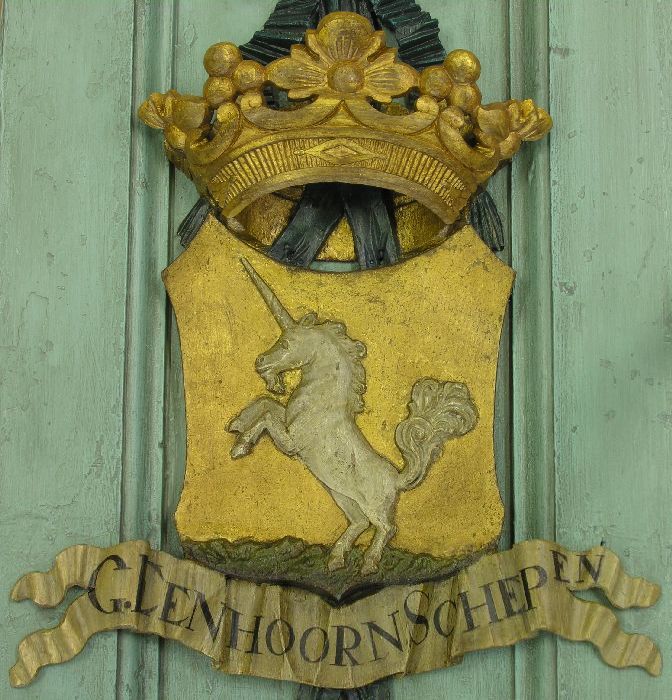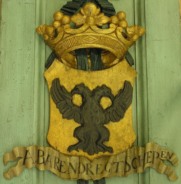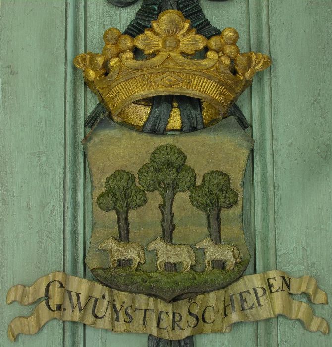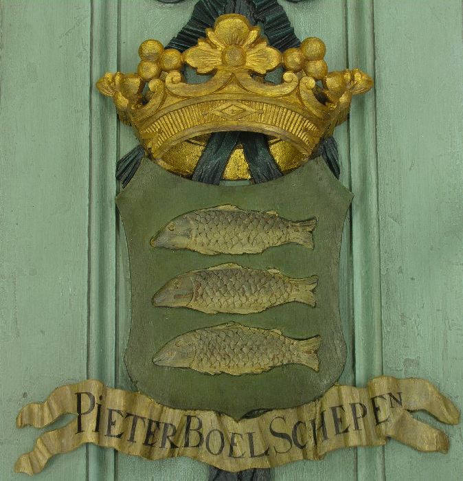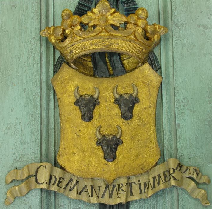 Gekroond familiewapen uit hout gesneden, schild met ...