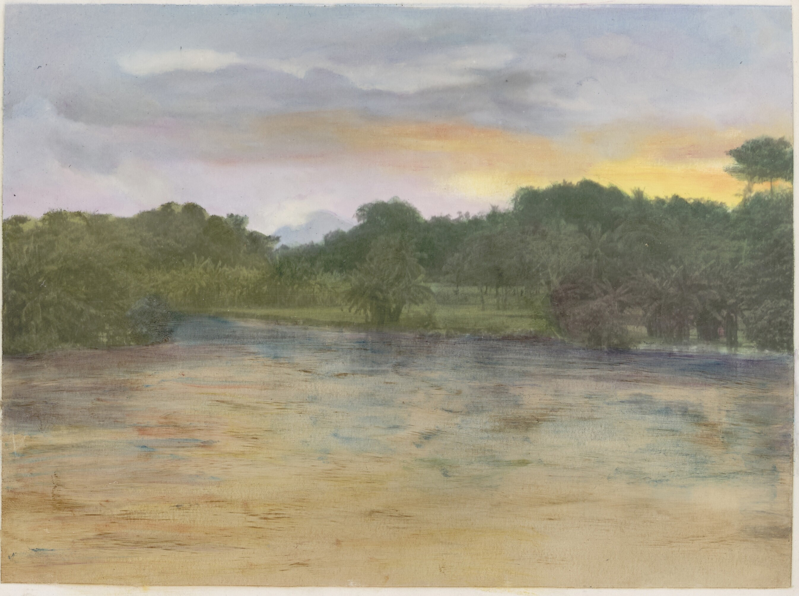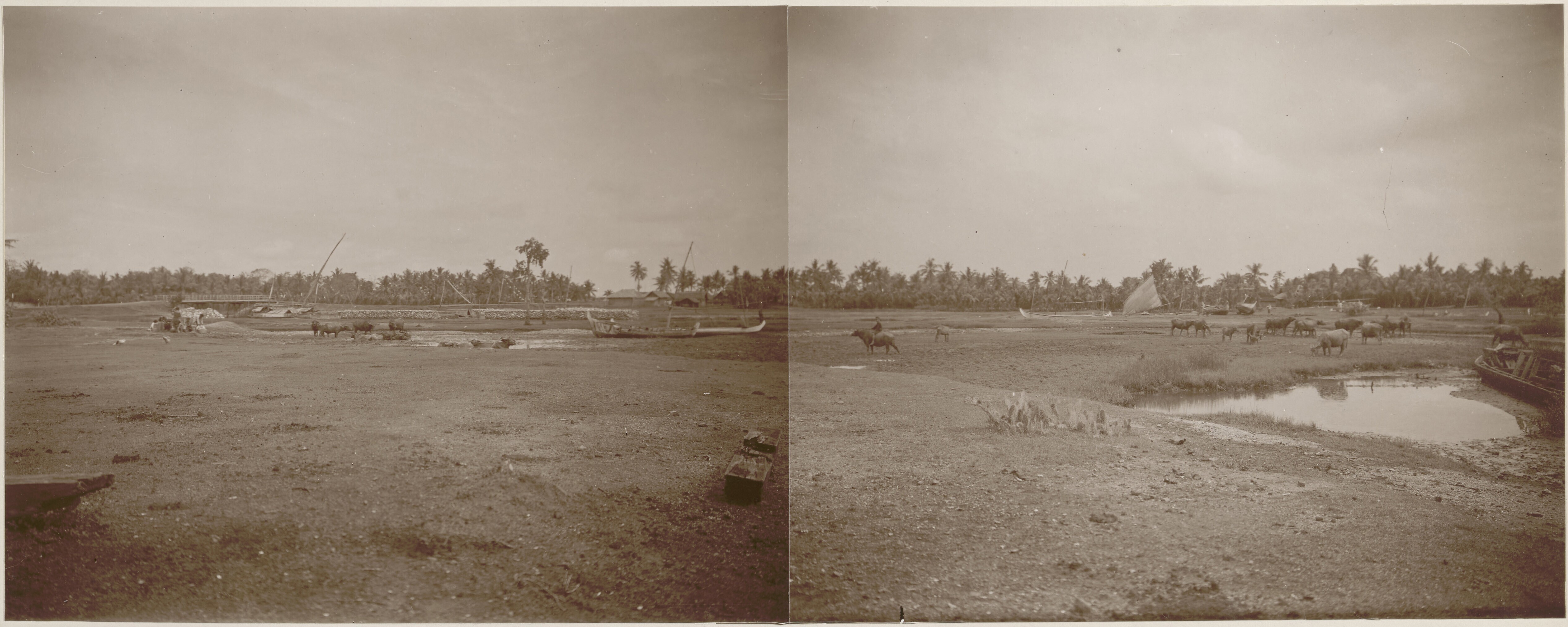 Grazende en badende runderen naast de rivier, Pasilian