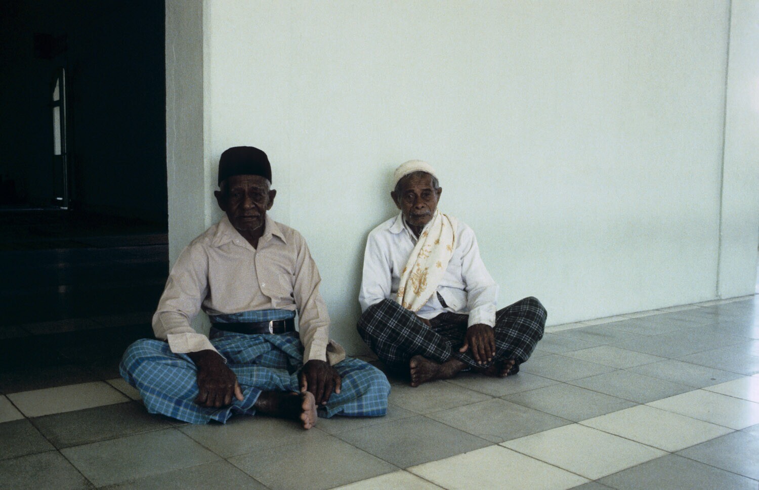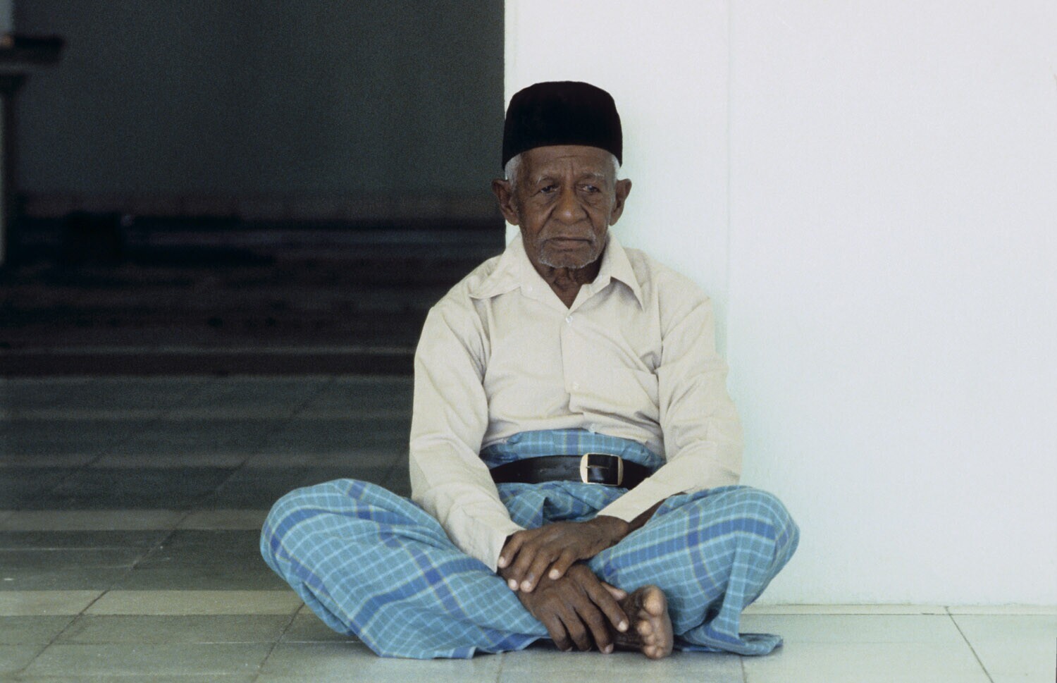 Moslim voor de moskee in Tulehu op Ambon, Molukken