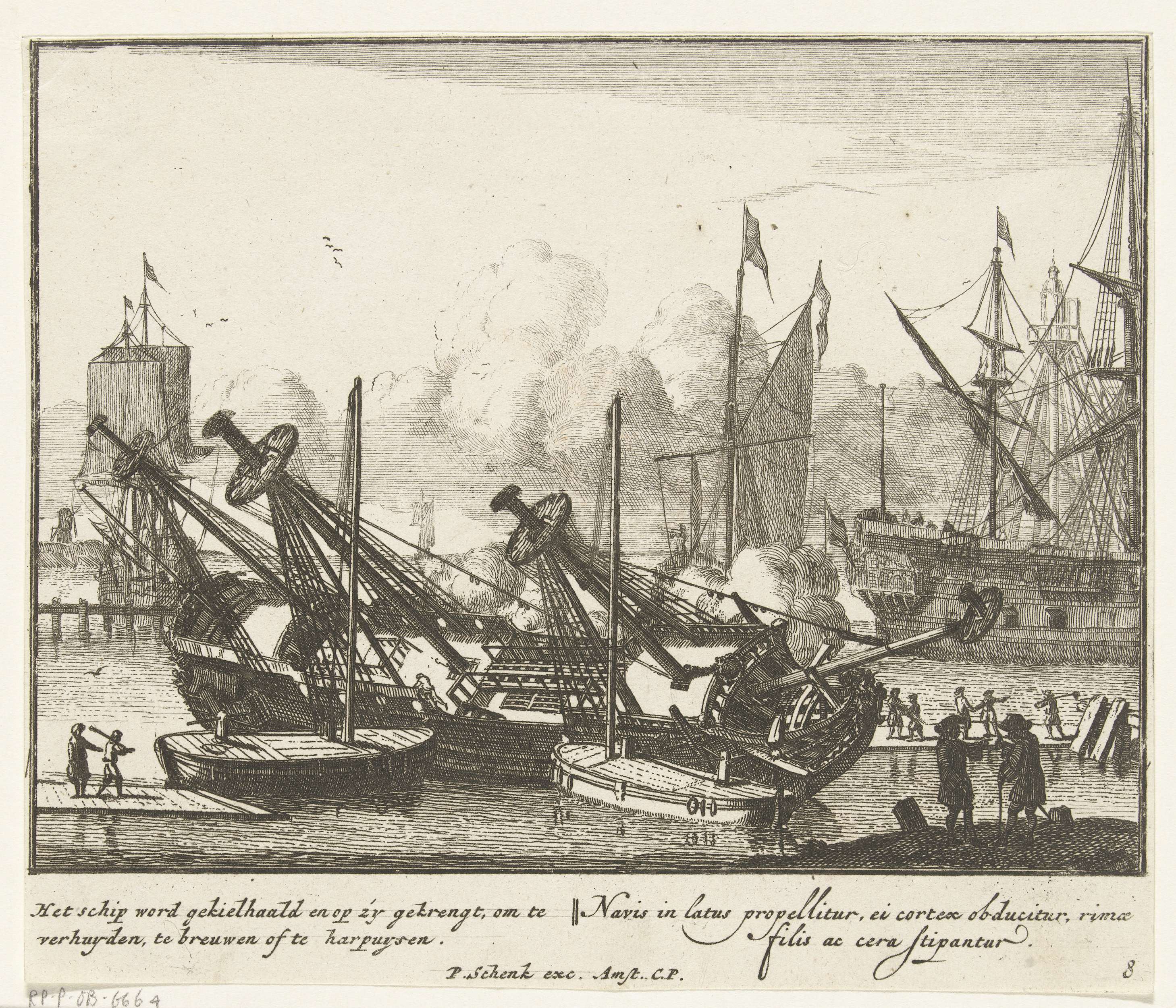 Het te water laten van het schip, plaat nr. 5, ca. 1700