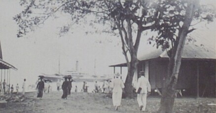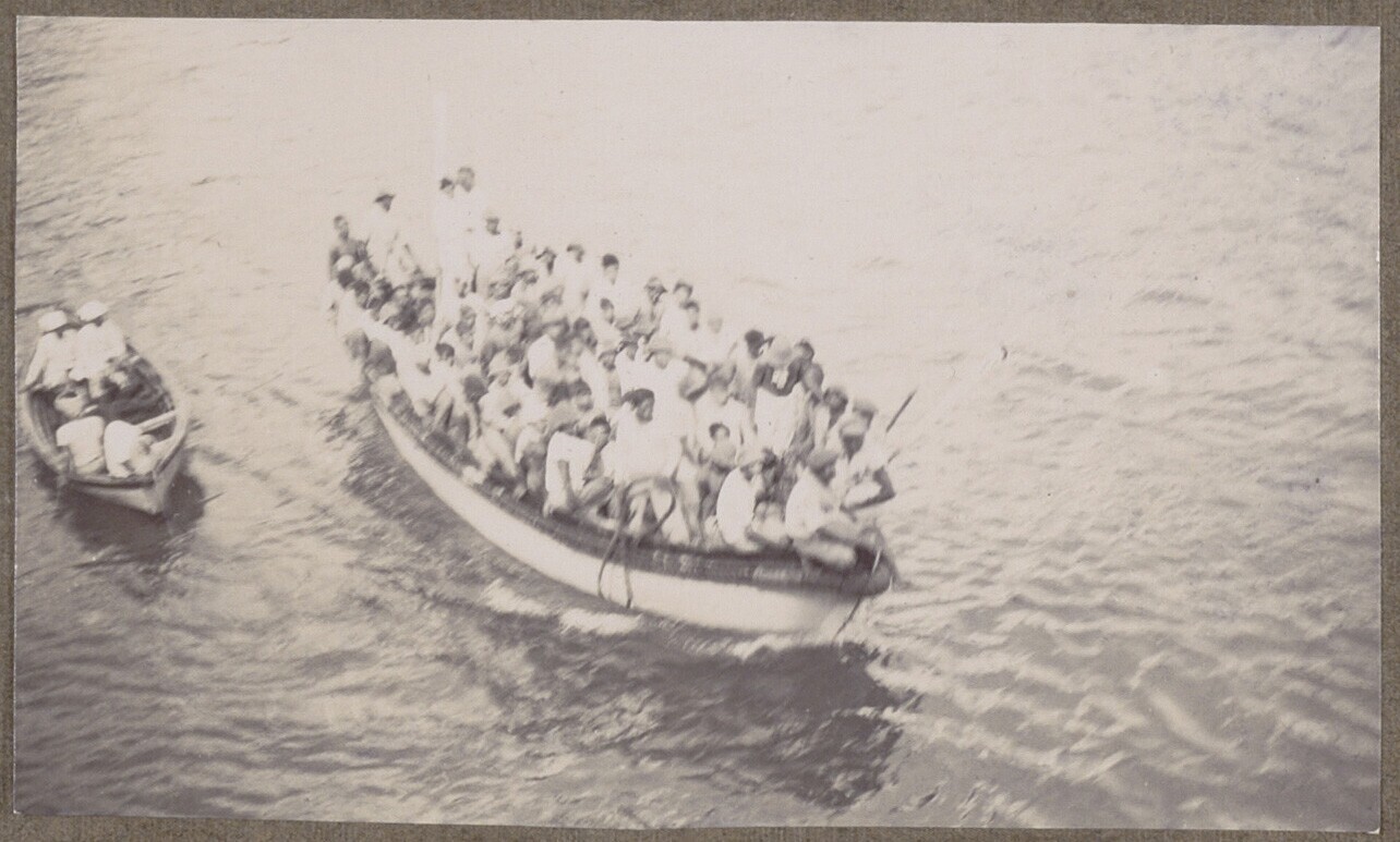 Schip voor de kust met aan wal Europeanen en Indiers...