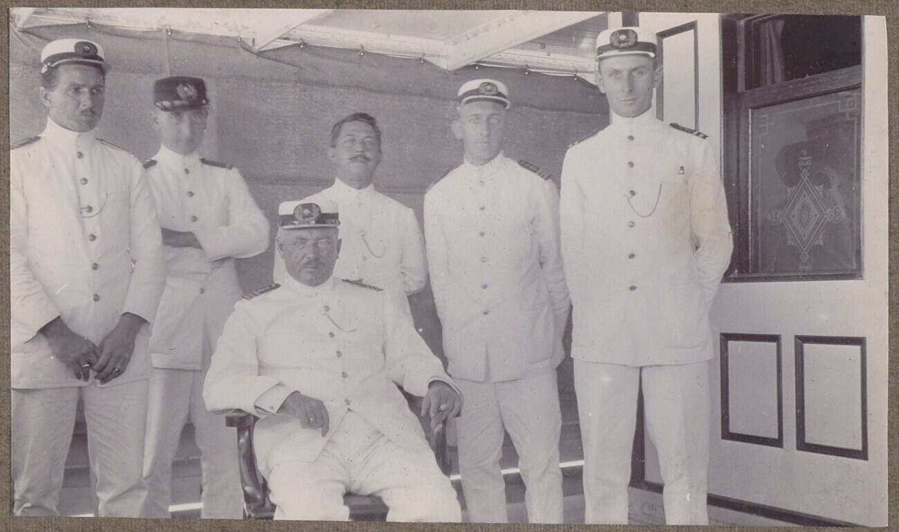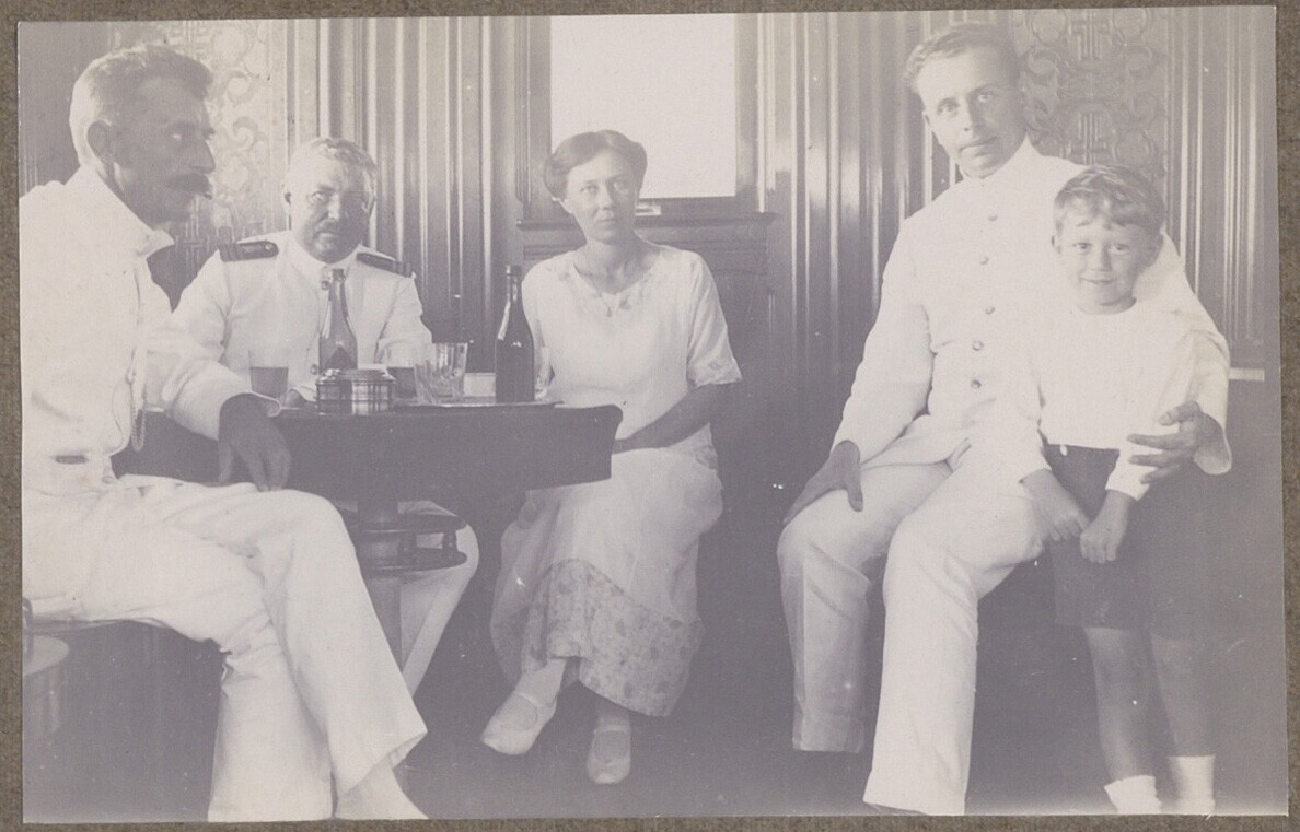 Kapitein Hobma en familie Huijgens aan boord van sto...