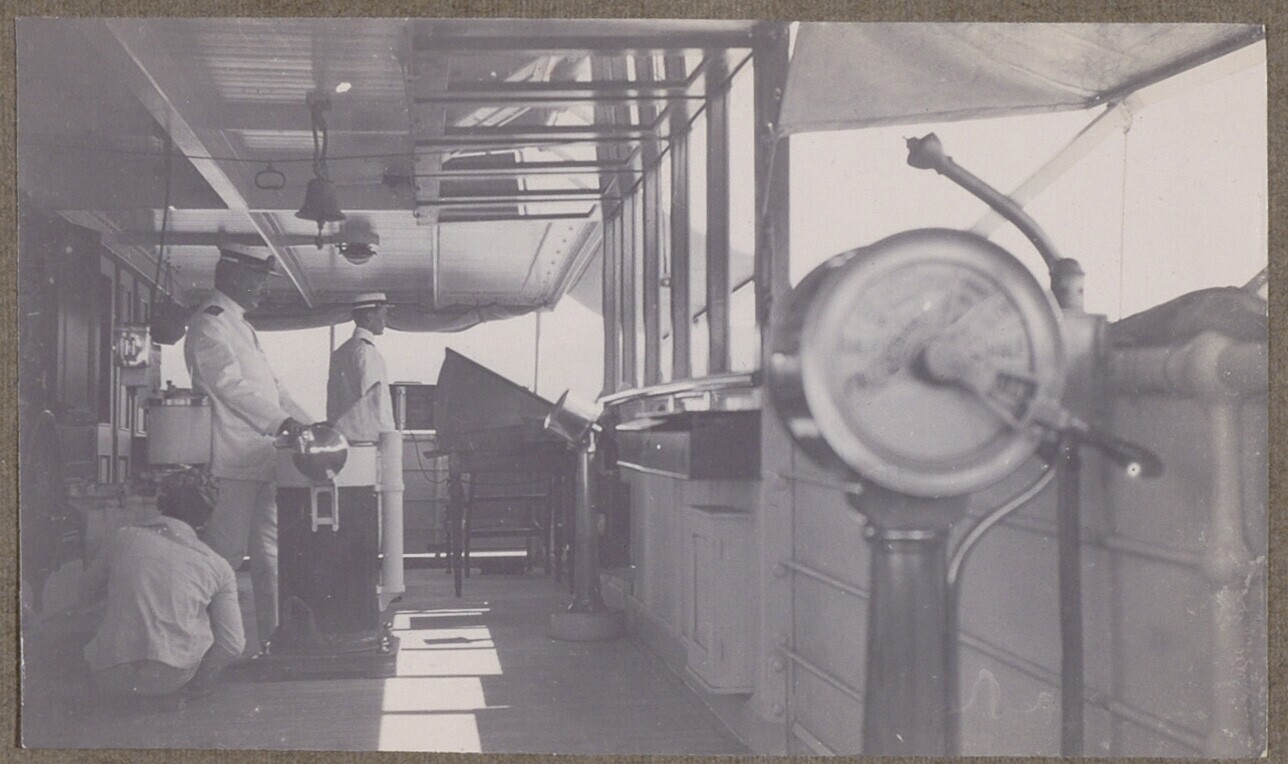 Kapitein Hobma en tweede stuurman in de stuurhut van...