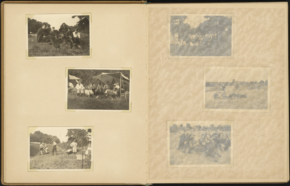 groepsfoto Duitse militairen in het gras en voor een...