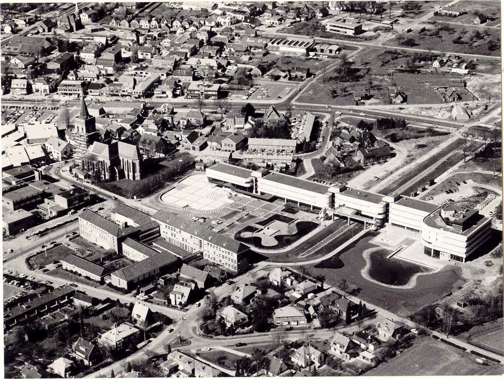 Luchtfoto van Ede, 1977 9 met o.a. nieuwe Raadhuis)
