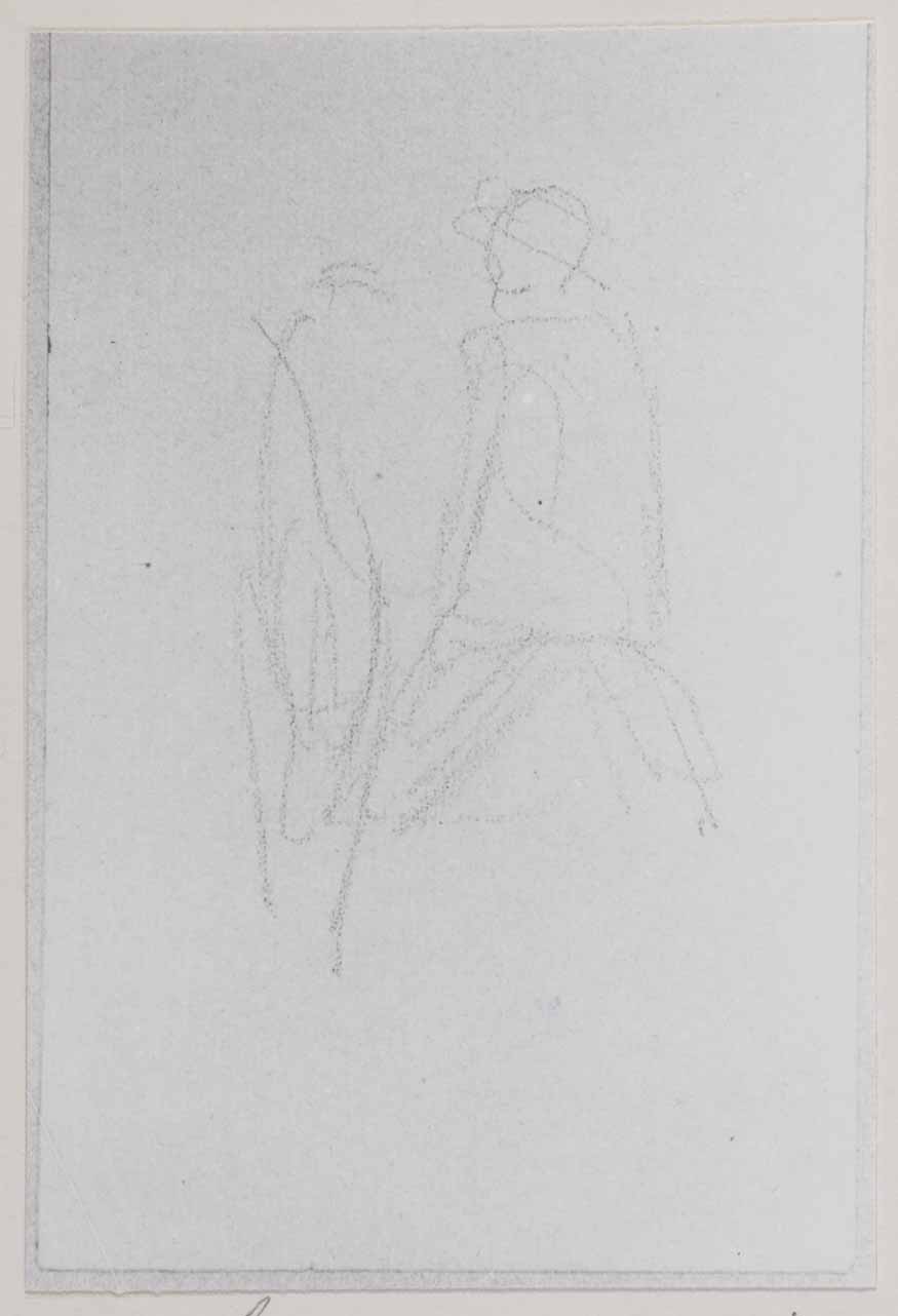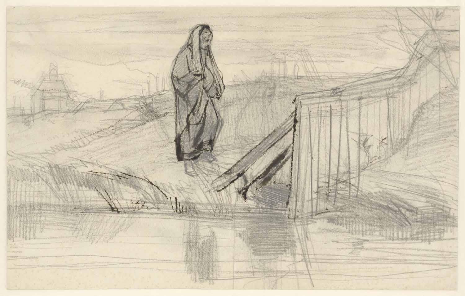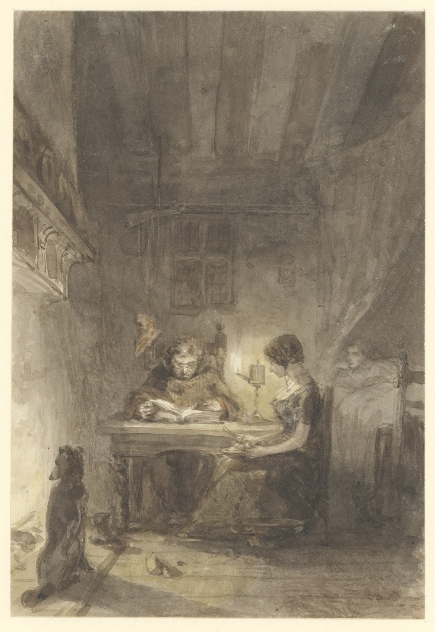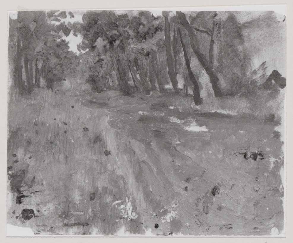 Boven: bosweg; onder: hurkende man en vrouw bij krukje