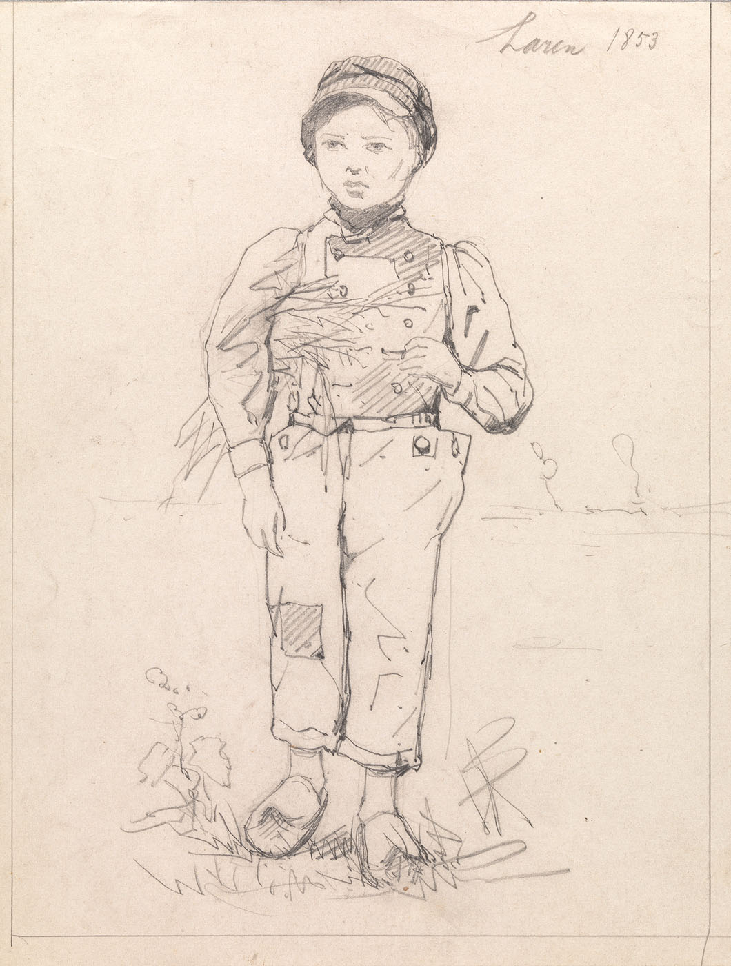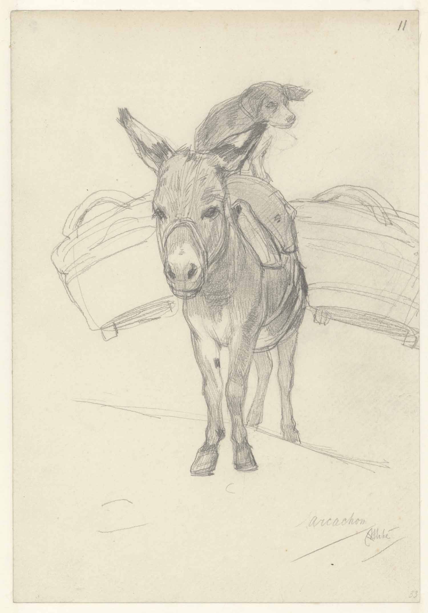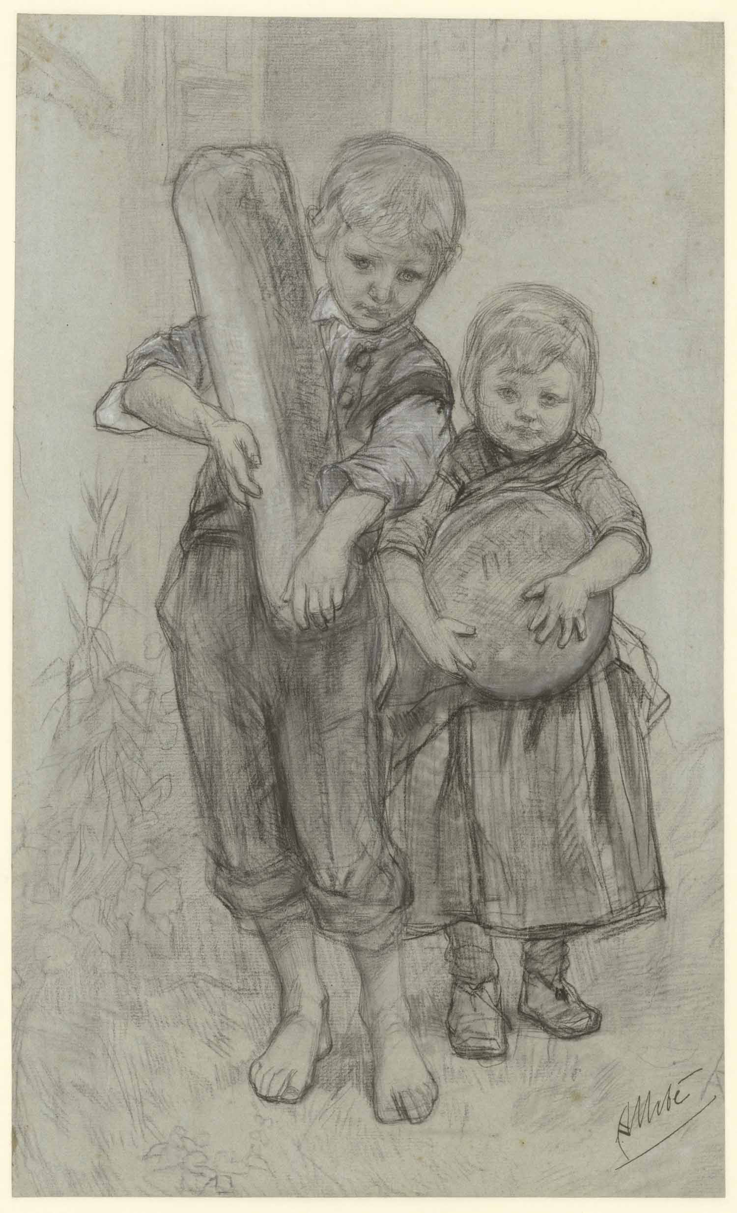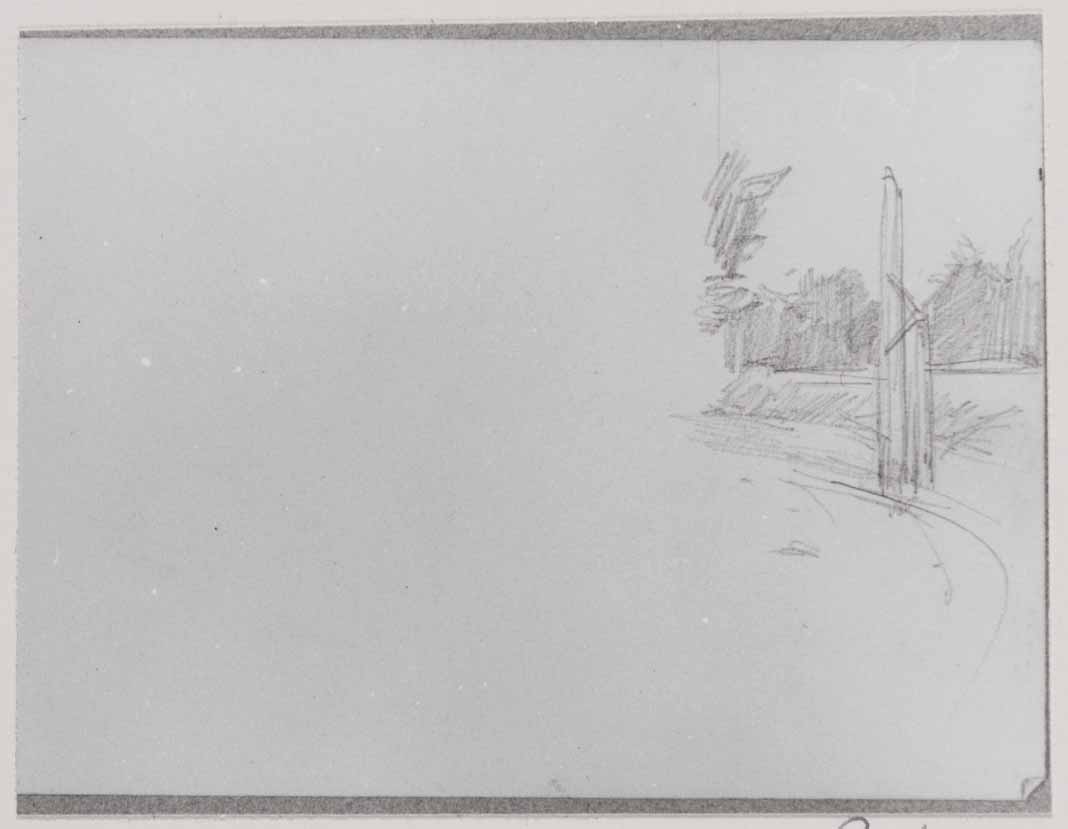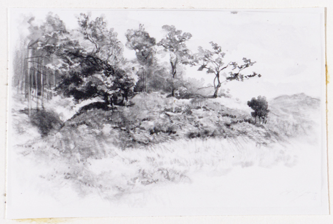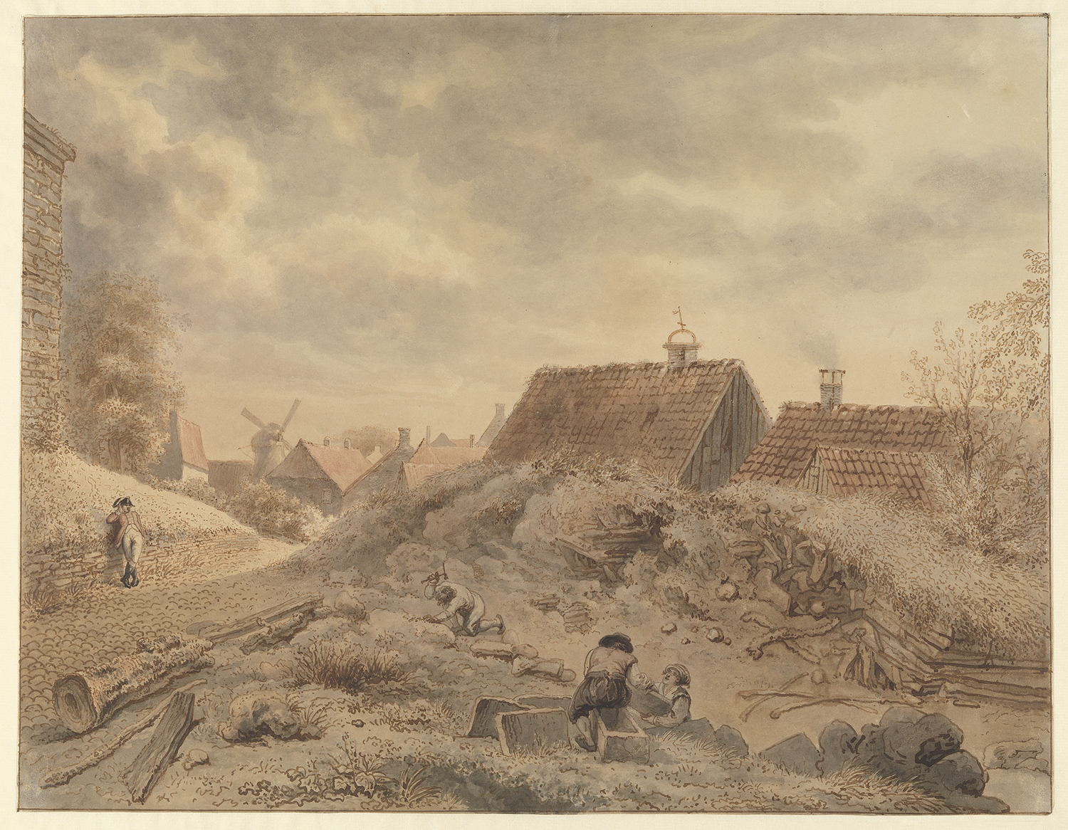Boven: bosweg; onder: hurkende man en vrouw bij krukje