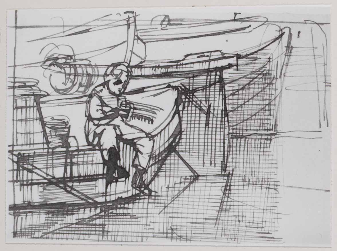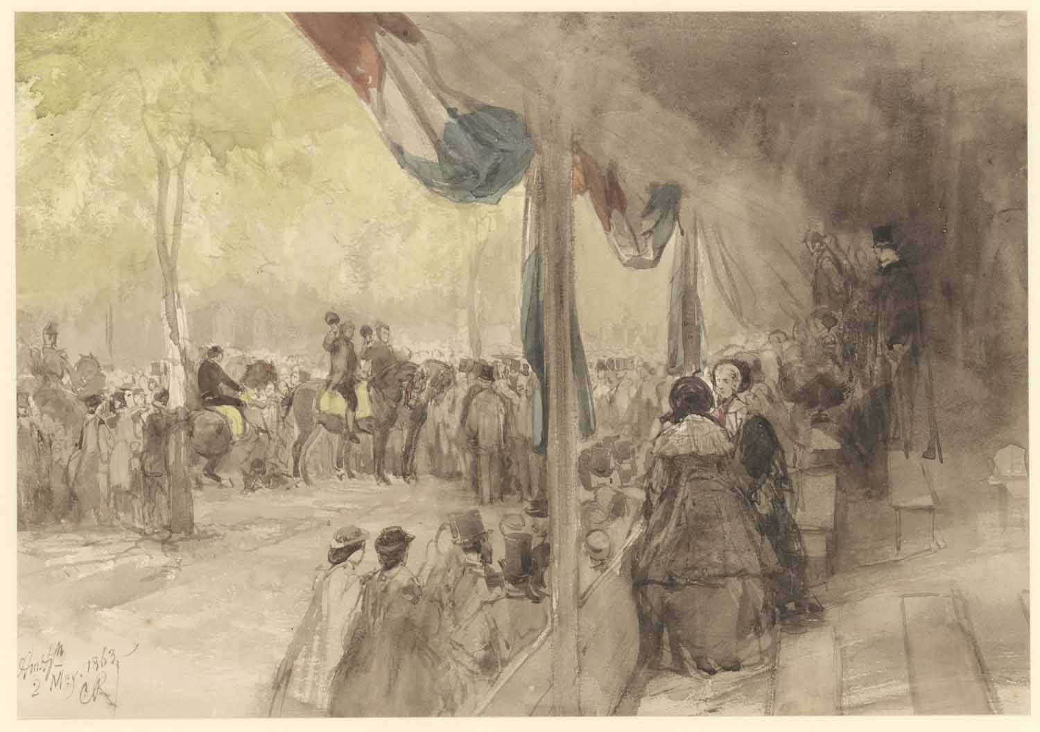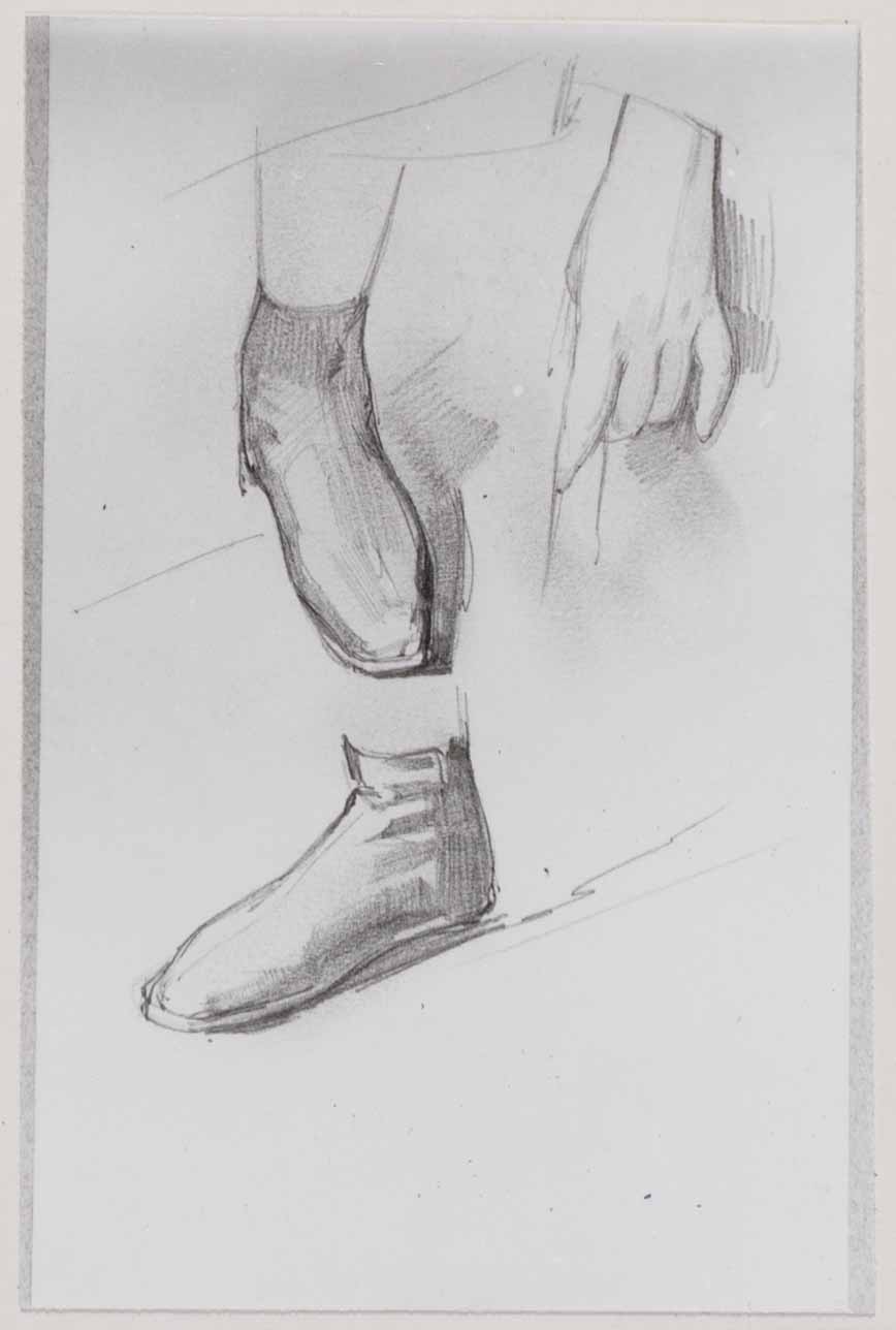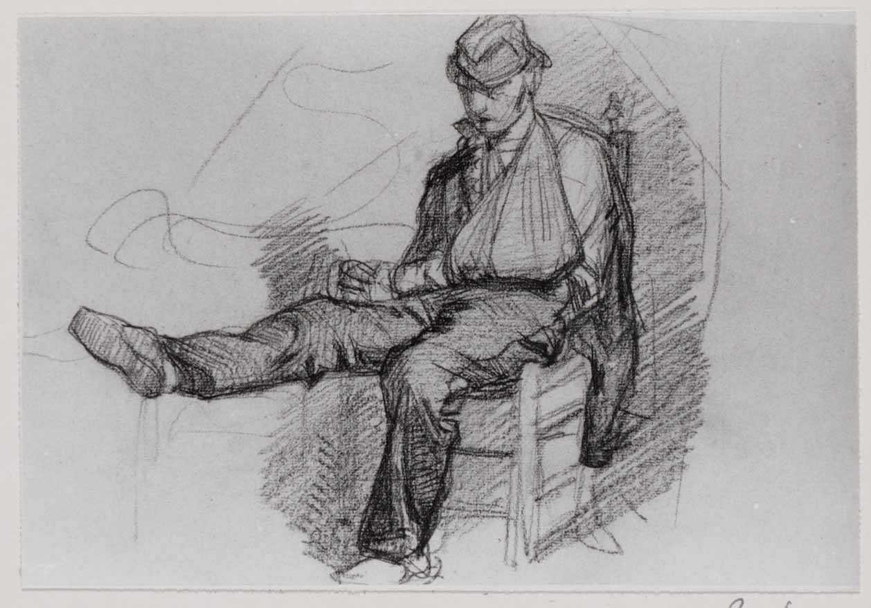 Boven: bosweg; onder: hurkende man en vrouw bij krukje