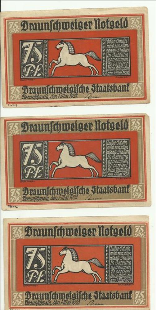 Noodgeld Braunschweiger, 75 pf,1921, 3 stuks