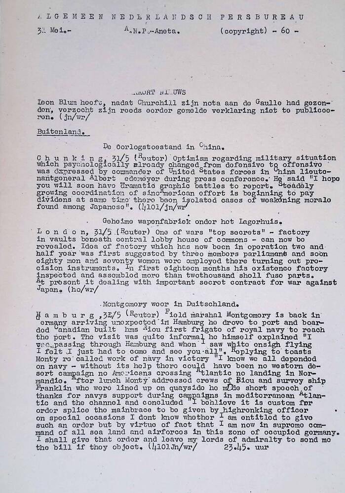 Algemeen Nederlandsch Persbureau, mededelingen, 31 m...