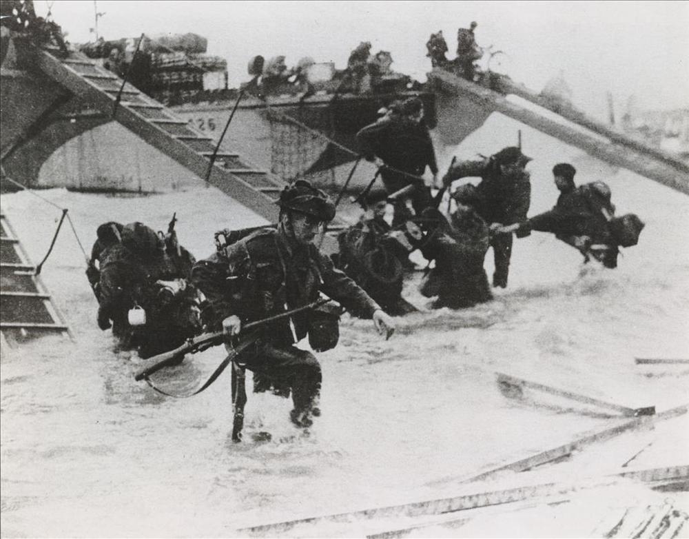 Engelse militairen verlaten landingschepen te Normandië